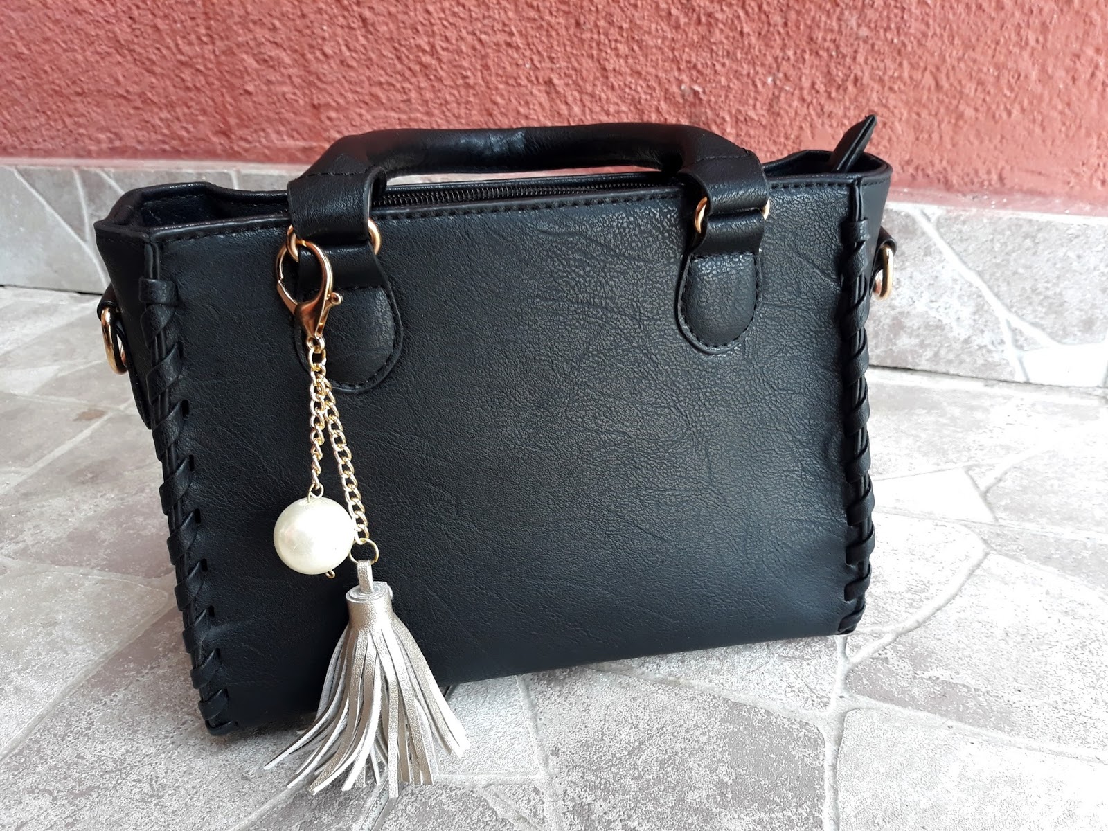 First bag in this review is this shoulder bag, black color, maden from polyester and leather. The design is very unusual and beautiful. The bag has a nice glare, and fine details in itself. It's smaller than I wanted and i'm ot so happy beacuse it. But, You can put all the basic things you need in it. It has two handles, one is short and long is long. This allows carrying over your arm, or over your shoulder. There are also two pendants on it. It has a very nice pearl. The bag looked very branded and costly. In fact, it is convenient, and I like it very much. It is solid and very good. I recommend.
